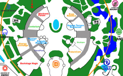 Il est aussi un reste des d'EPCOT avec l'agencement en cercle des pavillons des états, chacun présentant la même largeur et hauteur de façade que ses voisins, seule la profondeur de l'emplacement dans le bâtiment changeait. Mais les états furent remplacés par des sociétés technologiques.