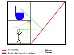 Une salle vide est montrée au public depuis un espace surélevé. Une vitre positionnée en oblique sépare la salle en deux et offre une surface de réflexion. Une partie de la salle est décorée avec les accessoires désirés. Sous les visiteurs une salle contient des personnages disposés comme s'ils étaient dans la salle mais de façon symétrique. Ici ce sont des audio-animatronics éclairés par intermittence pour simuler leurs apparitions-disparitions. L'image des personnages est réfléchie sur la paroi vitrée.