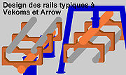 Le design général des rails Vekoma ressemble énormément, à quelques nuances près, au modèle utilisé par Arrow Dynamics sur ses modèles les plus reconnus des années 1980 et 90. Vekoma a été l'un des premiers constructeurs à utiliser deux rails de forme tubulaire pour favoriser les parcours courbés et tortueux des trains sur la voie. Les roues de trains Vekoma s'emboîtent au sein des rails tubulaires. Ces rails sont reliés de l'extérieur à une porteuse tubulaire plus grosse par des tiges tridimensionnelles en forme de crochet. La porteuse est en dessous de la paire de rails et est soutenue par des piliers cylindriques ou par des échafaudages composés de poutres entrecroisées.